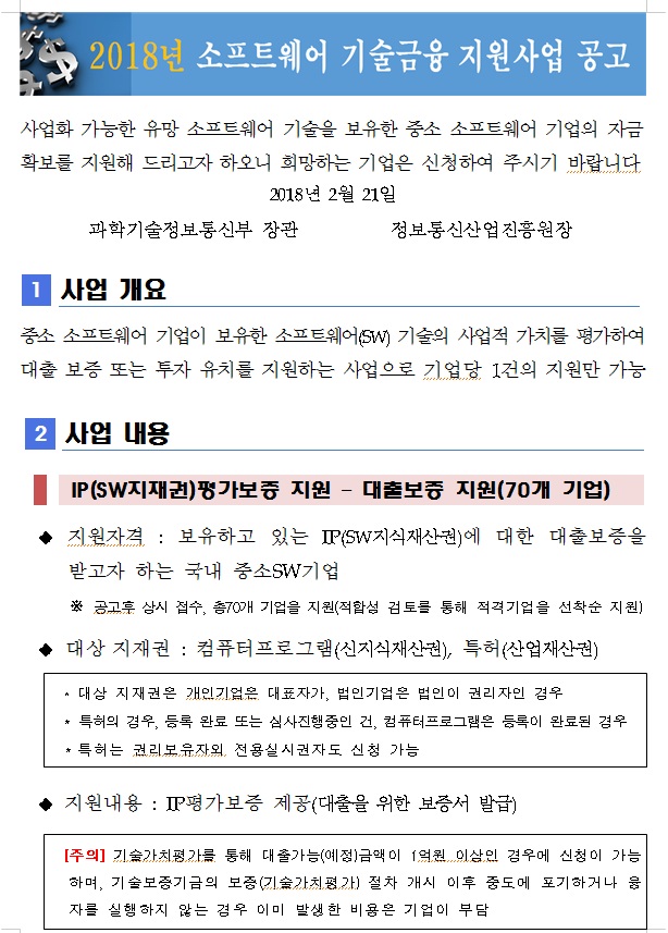 (사업안내서) 2018년 SW기술금융 지원 사업 안내서.pdf (파일크기: 310 KB )