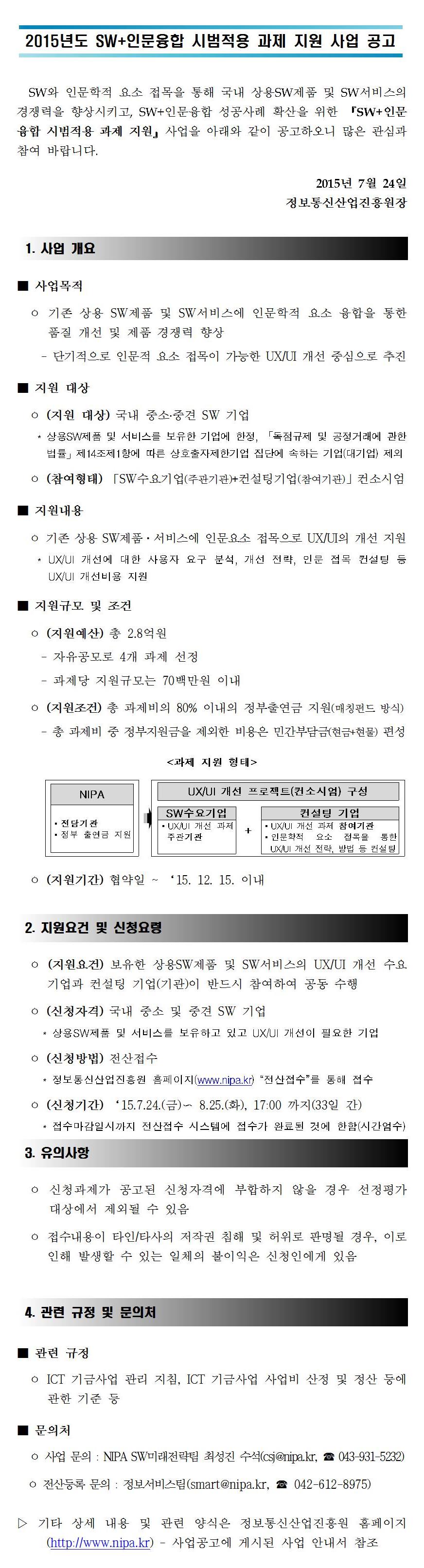 2015년도 SW+인문융합 시범적용 과제 지원 사업 공고