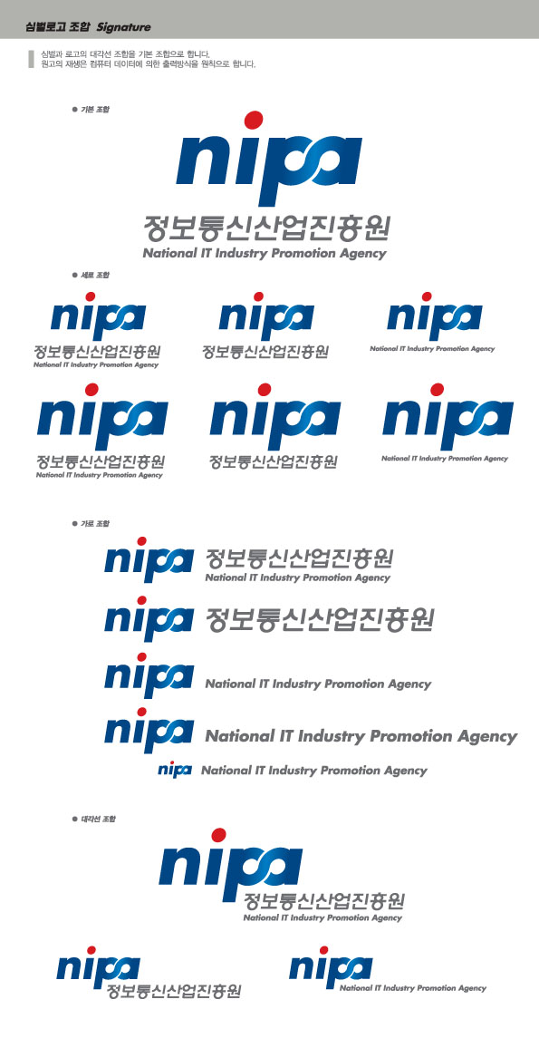 CI소개 2023-01-15 By 산업융합의 리더로서 정보통신산업진흥원을힘차고 강인하게 표현한 워드마크입니다. AI다운로드 JPG다운로드 선진미래를 향한 무한한 성장의 컬러 알파벳 p와 a가 서로 맞물린 형태를 이용한 뫼비우스의 띠는 선진미래를 향한 정보통신 산업의 무한한 성장을 나타냅니다. 강인한 서체와 진한 블루 컬러는 미래지향적이며 진취적인 정보통신산업진흥원의 힘찬 출발을 의미하며, 빨간색 포인트는 IT 산업에 대한 정보통신산업진흥원의 열정적인 의지를 나타냅니다. Main Color NIPA Dark Blue C100 M60 Y0 K30 R9 G40 B105 PANTONE 288c Sub Color C0 M100 Y100 K10 C100 M65 Y0 K30 ~ C100 M40 Y0 K35 C0 M0 Y0 K70 로고타입 기본형 심볼로고 기본조합 심볼로고 조합